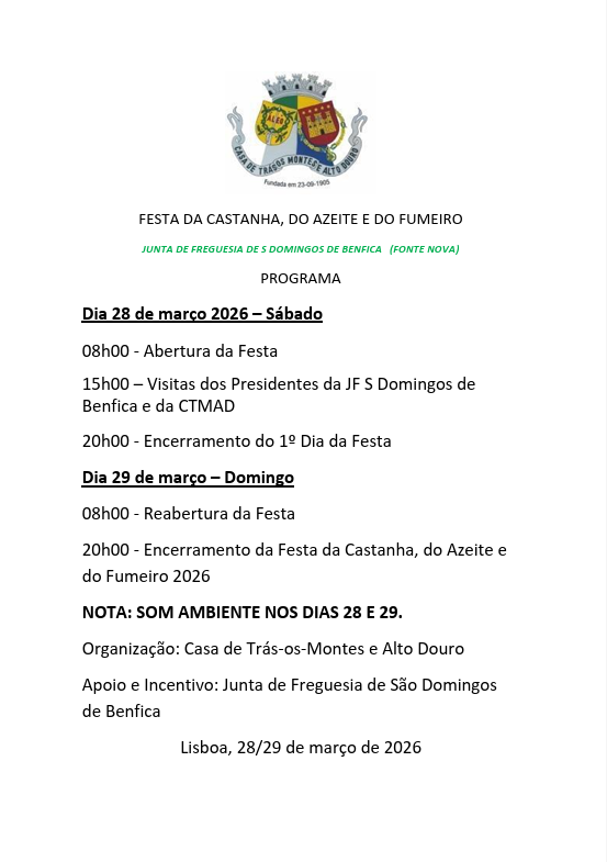 𝗔 𝗖𝗮𝘀𝗮 𝗱𝗲 𝗧𝗿á𝘀-𝗼𝘀-𝗠𝗼𝗻𝘁𝗲𝘀 𝗲 𝗔𝗹𝘁𝗼 𝗗𝗼𝘂𝗿𝗼, com o apoio da Junta de Freguesia de São Domingos de Benfica, vai realizar no fim de semana de 09 e 10 de novembro, a tradicional Festa da Castanha, no 𝗟𝗮𝗿𝗴𝗼 𝗲𝗺 𝗙𝗿𝗲𝗻𝘁𝗲 𝗮𝗼 𝗖𝗲𝗻𝘁𝗿𝗼 𝗖𝗼𝗺𝗲𝗿𝗰𝗶𝗮𝗹 𝗙𝗼𝗻𝘁𝗲 𝗡𝗼𝘃𝗮, 𝗟𝗶𝘀𝗯𝗼𝗮!